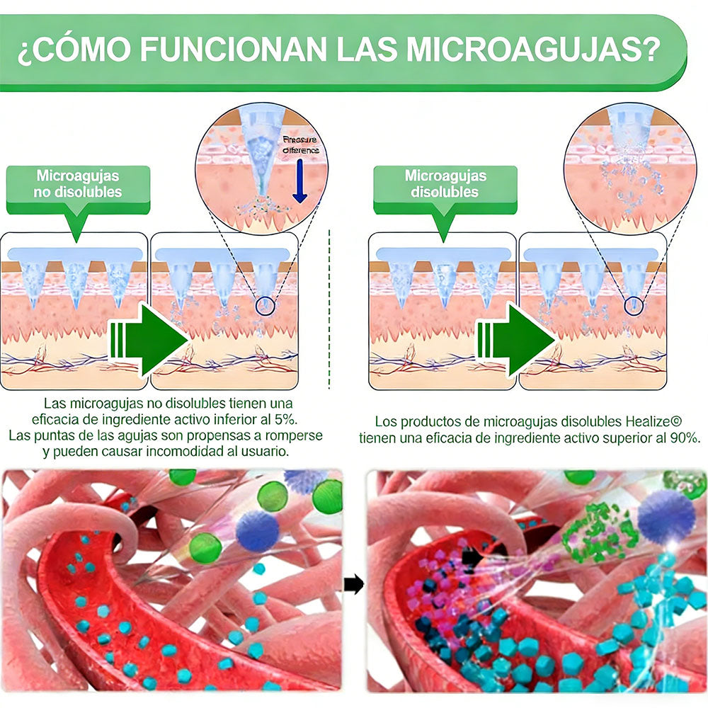 Nuestro parche de nanomicroagujas está dermatológicamente probado y diseñado con precisión para controlar la liberación transdérmica de ingredientes activos. Si bien la piel actúa naturalmente como una barrera fuerte, este avanzado sistema de nanomicroagujas está específicamente diseñado para penetrar dicha barrera de forma segura y eficaz. Cada microaguja tiene tan solo 0,27 mm de longitud (aproximadamente una séptima parte del grosor de un cabello humano) y está fabricado con materiales bioactivos solubles, lo que garantiza una aplicación suave y prácticamente indolora, a la vez que libera los ingredientes directamente en la piel.